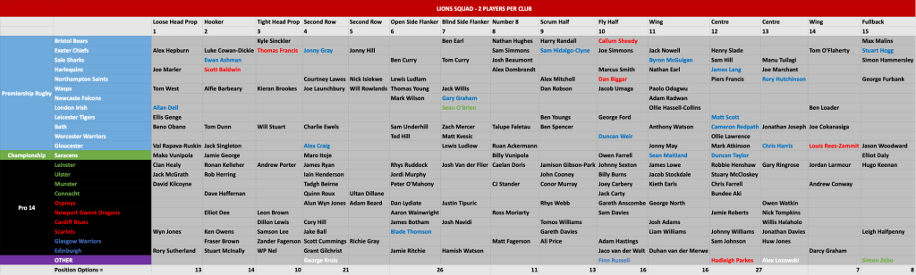 Starting selection was difficult with many different names all over the place on the spreadsheet. The fixed structure of players per position made it a lot easier. My 46 man squad is five more players than the 2017 initial real Lions squad. Four of these extra players are from the front row and second row. Lions tours are famously brutal and physical so this led to picking extra players in the most physical positions. The final extra player is a scrum-half. The replacement scrum-half is the reason for this, having four 9s on this fantasy tour means many options for the type of impact player to come on.